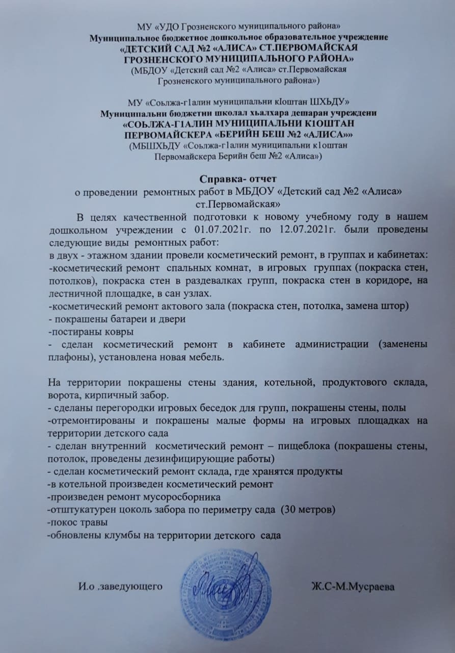 Справка-отчет о проведении ремонтных работ в МБДОУ "Детский сад №2 "Алиса" ст.Первомайская"